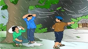 Bắt dầu vào mùa mưa rồi, Lâm và Thu đang trên đường về thì bỗng thấy mây đen kéo đến đầy trời. Lâm bảo Thu vào nấp dưới cây to, hai bạn vừa chạy vào thì trời đổ mưa như trút nước. Tiếng sấm rền vang, rồi những tia sét lóe lên chói lòa ở phía xa làm Thu sợ quá, bấu chặt vào tay Lâm. Lâm liền động viên bạn, " chúng mình trú dưới cái cây này an toàn rồi, cứ yên tâm!"