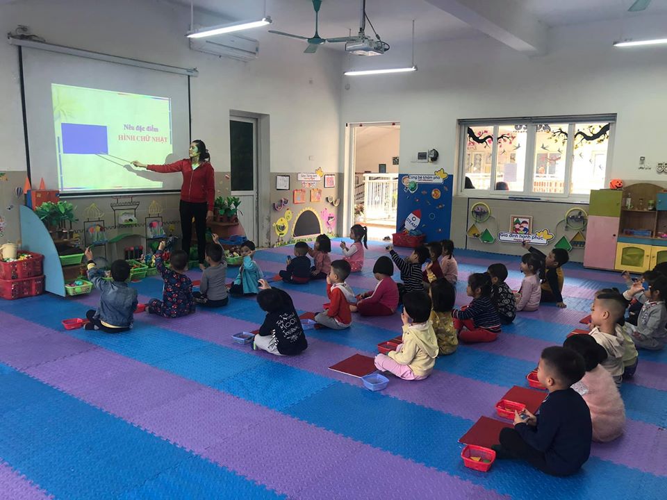 Ngày hôm nay, các bạn nhỏ của lớp B1 được Cô Duyên và cô Hà nhận biết và phân biệt 4 hình: Tròn, vuông, tam giác và chữ nhật. Không chỉ gọi tên các hình, các bé còn được phân biệt đặc điểm giống và khác nhau của các hình học đó, từ số cạnh, số góc, cho đến đường bao quanh. đặc điểm đặc biệt của các hình như lăn được hay không lăn được...