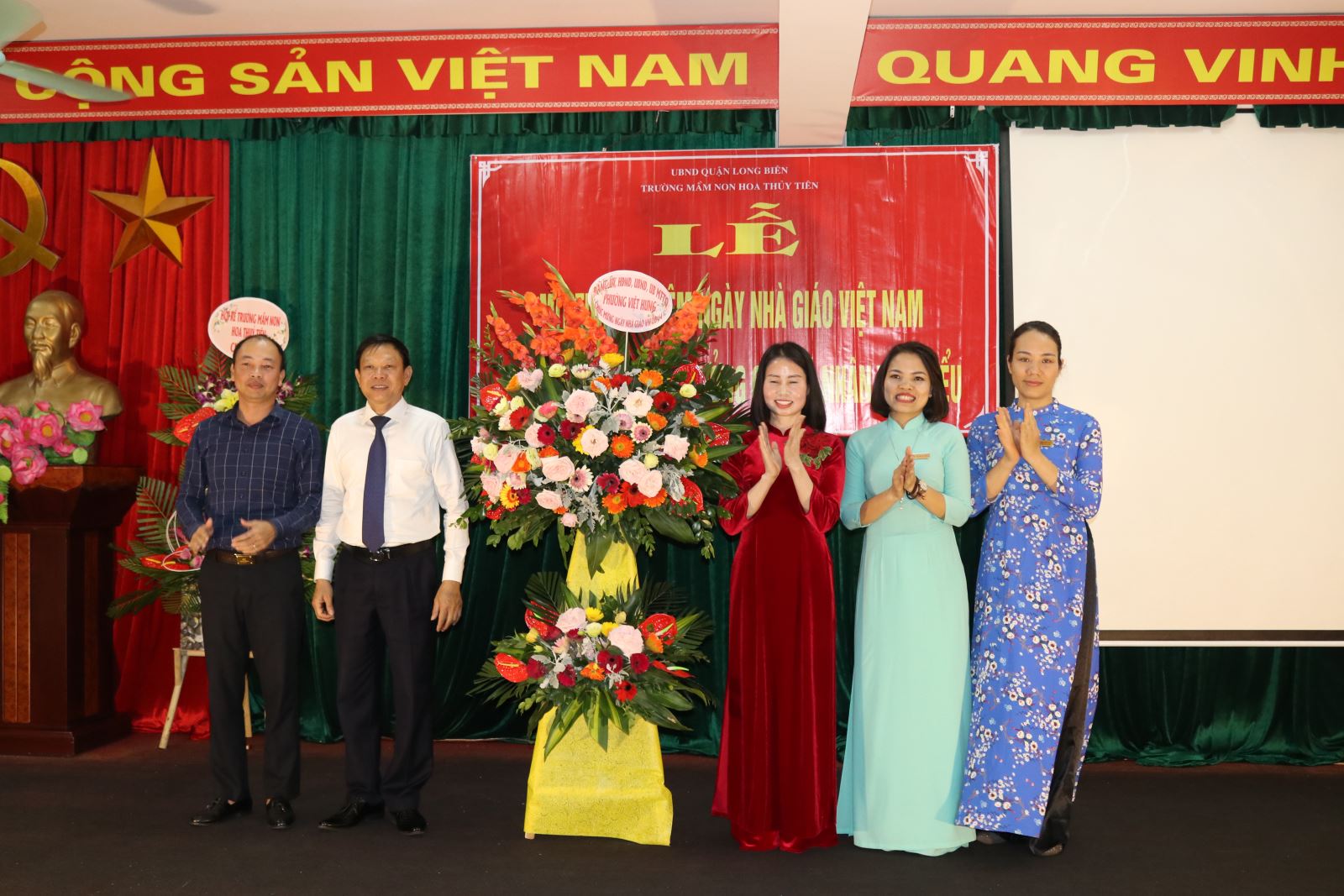 Lãnh đạo UBND phường Việt Hưng tặng hoa chúc mừng nhà trường