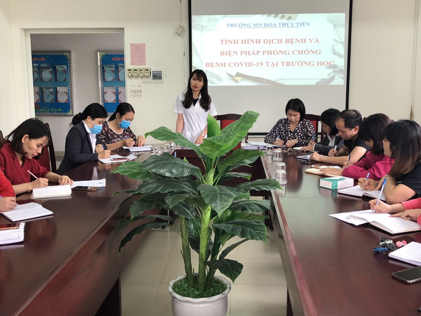 Thực hiện các Cv chỉ đạo của các cấp lãnh đạo về công tác phòng chống dịch bệnh Covid 19, nhận thức rõ sự nghiêm trọng của dịch bệnh viêm đường hô hấp cấp do Covid-19 gây ra. Trường MN Hoa Thủy Tiên luôn chủ động và thực hiện các biện pháp phòng, chống dịch một cách tốt nhất như đầu tư về trang thiết bị, cơ sở vật chất, vệ sinh môi trường, khử khuẩn đồ dùng, đồ chơi....Bên cạnh đó việc cung cấp kiến thức phòng, chống dịch cho CBGVNV được nhà trường đặc biệt quan tâm. Sáng ngày 28/2/2020, nhân viên y tế nhà trường tập huấn cho 100% CBGVNV nhà trường về tình hình dịch bệnh, các biện pháp phòng tránh, các biện pháp đảm bảo an toàn cũng như cách sử dụng cách trang thiết bị phục vụ công tác phòng dịch và phương án xử lý tình huống tại chỗ một cách an toàn nhất .