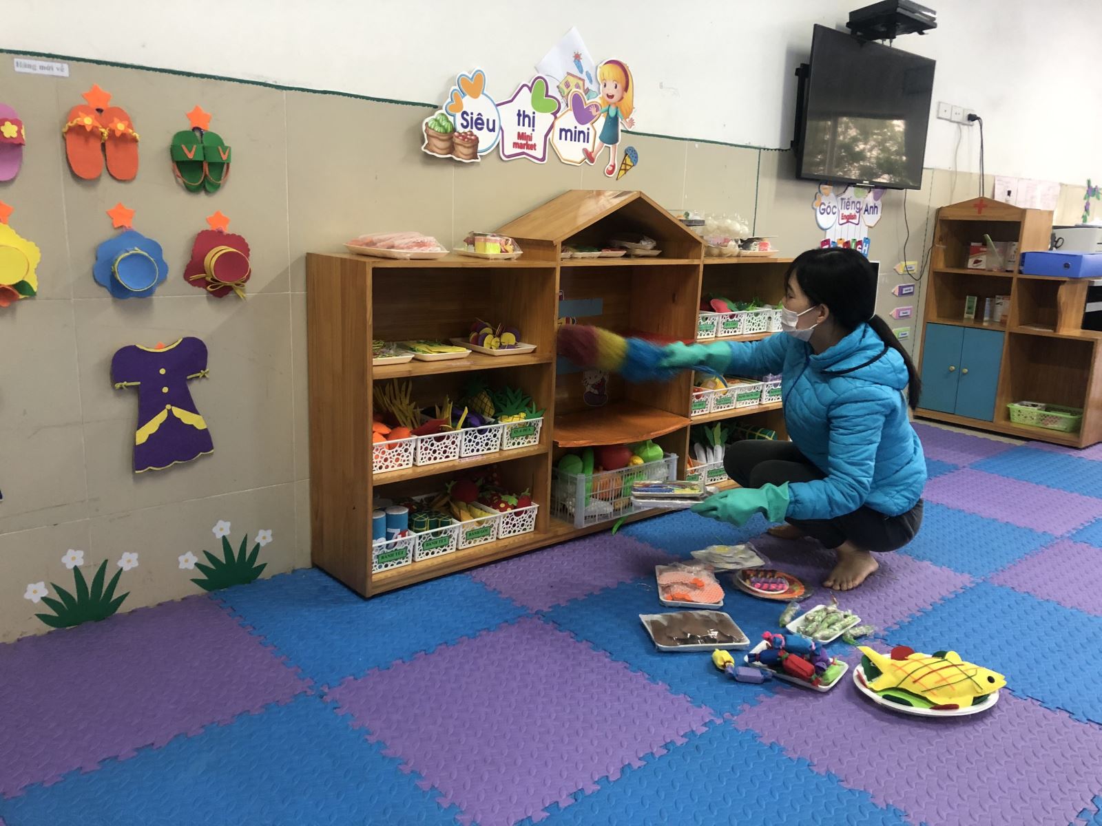 Toàn bộ giáo viên của các lớp tổ chức khử khuẩn trong lớp học, các phòng chức năng, hiên trước sau, nhà vệ sinh, cầu thang, tay vịn, đồ dùng đồ chơi, dụng cụ học tập và các đồ vật trong phòng học, cửa kính, tay nắm cửa, tay vịn cầu thang, tay vịn lan can, bàn ghế… bằng dung dịch CloraminB và các chất tẩy rửa thông thường. Vệ sinh khăn lau mặt, lau tay bằng xà phòng, cây nước, tủ cốc, chăn, gối, giường của trẻ….