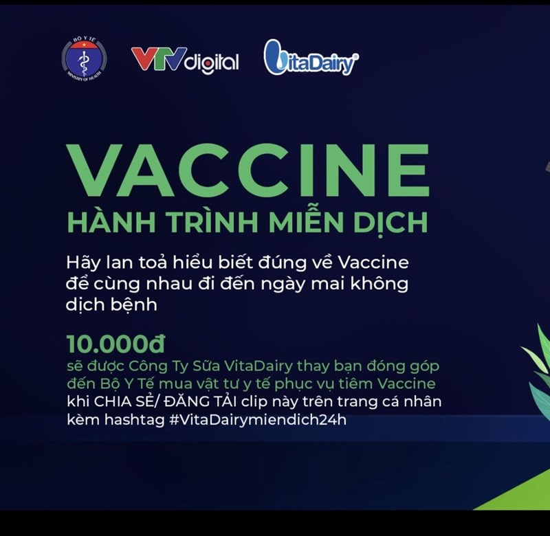 Trước đó, tiếp nối các hoạt động trách nhiệm xã hội và chung tay đẩy lùi dịch bệnh, Bộ Y tế phối hợp với VTV Digital và đối tác liên quan phát động chương trình “Vắc xin - Hành trình miễn dịch” cùng thông điệp “Chia sẻ hiểu biết đúng về vắc xin để cùng nhau đi trên hành trình đến ngày mai không dịch bệnh”.