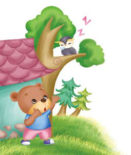 Đằng sau nhà của Gấu con có một cái cây rất to, không biết từ lúc nào đã có một chú Chim bay đến làm tổ trên cái cây này. Gấu con nhìn thấy Chim, liền nghĩ bụng: “Mình có hàng xóm rồi, đúng là một việc đáng mừng!” Hôm sau, Gấu con đi tìm người bạn mới này thì thấy hàng xóm mới đang đậu trên cây, ngủ say sưa. Gấu con nghĩ: “Chắc là đêm qua bạn ấy không được ngủ, thôi cứ để cho bạn ấy ngủ vậy, ngày mai mình lại đến rủ bạn ấy đi chơi”. Hôm sau nữa, Gấu con lại vòng ra sau nhà và tìm người hàng xóm mới của mình, nhưng lần này nó cũng thấy bạn đang ngủ. Gấu con nghĩ: “Hàng xóm mới của mình đúng là rất thích ngủ”.